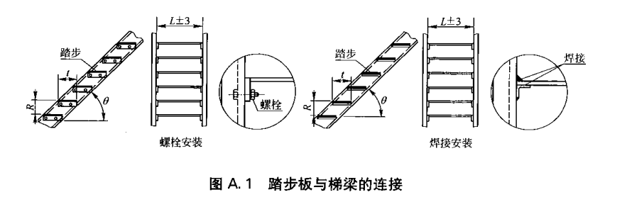 (8)踏步板與樓梯的鏈接采用焊接或螺栓固定,見圖A.1。采用螺栓固定時,螺栓規(guī)格不得小于M10。